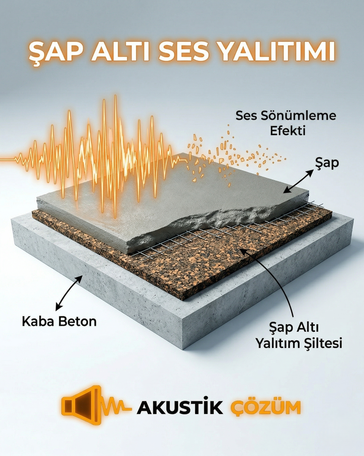 Şap altı ses yalıtımı malzemeleri (özel kauçuk şilteler, taşyünü levhalar veya çapraz bağlı polietilen köpükler), betonarme döşeme (kaba inşaat zemini) ile dökülecek son şap tabakası arasına serilir.