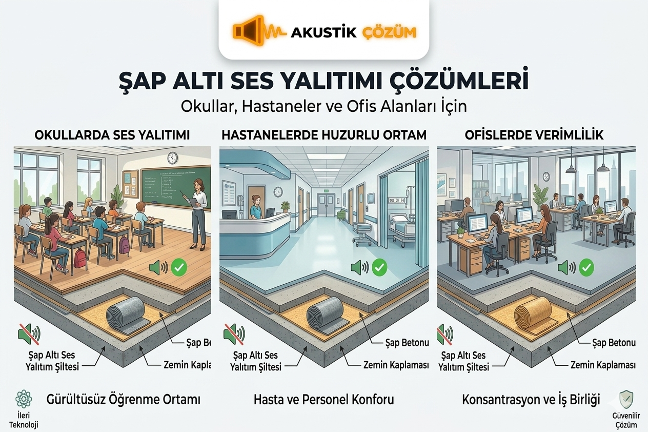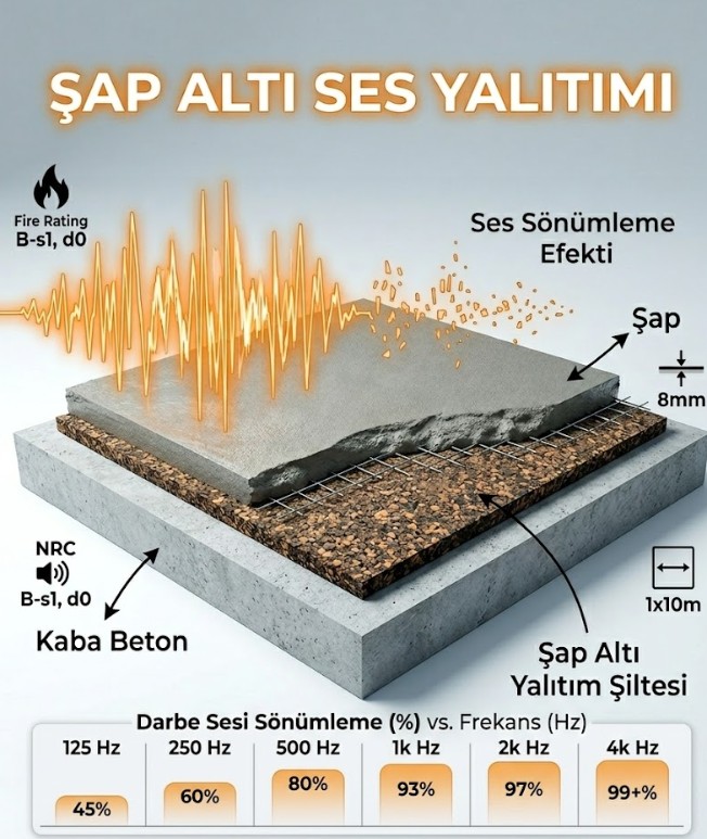 Şap altı uygulamaları, her iki ses türüne karşı da direnç gösterse de özellikle darbe sesi yalıtımı (L’n,w değerini düşürmek) konusunda hayati bir rol oynar.