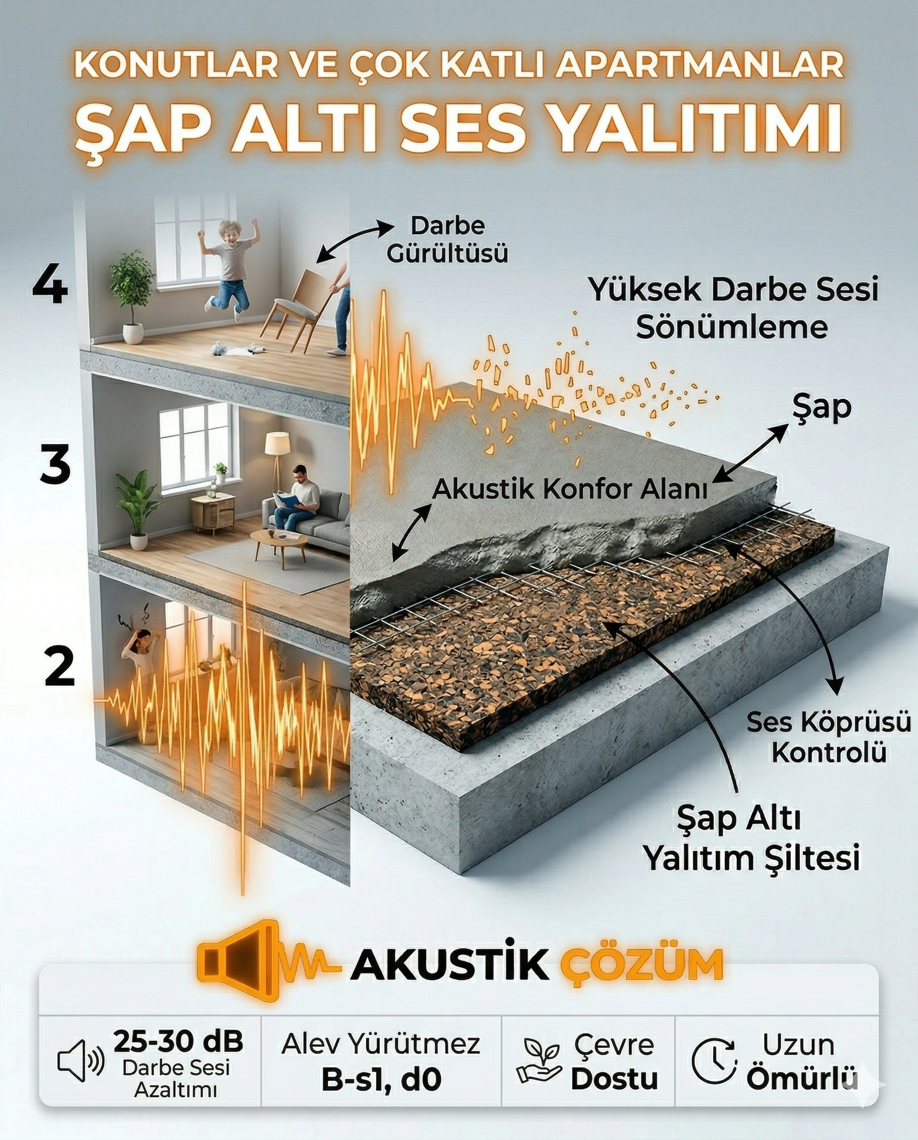 - Darbe Sesini Keser: Üst kattaki topuk seslerini veya mobilya hareketlerini alt kat sakinleri için duyulmaz hale getirir.