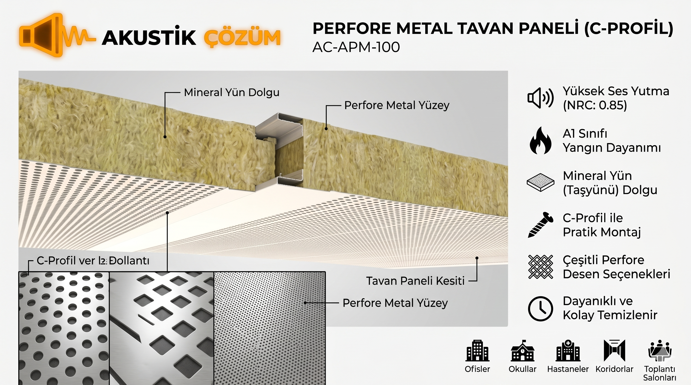 | Akustik Baffle & Yüzer Tavan | Yüksek tavanlı ofisler, spor salonları, AVM'ler | Yüksek | Çok Yüksek | Orta - Üst |
